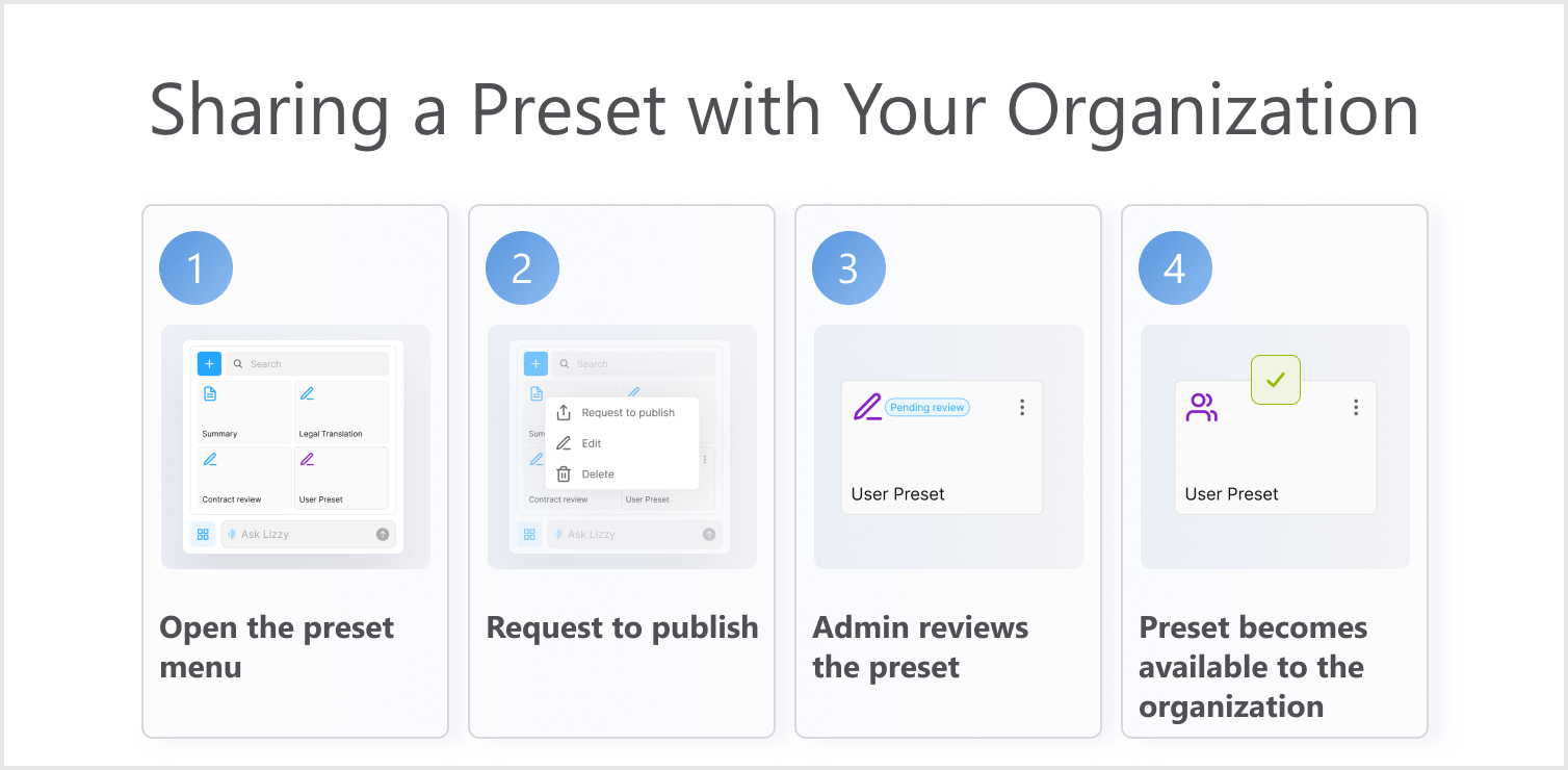 Presets can now be shared with your entire organization, allowing teams to build and reuse common workflows. If you have created a useful preset - for example for contract review, clause extraction, or translation - you can request to publish it so others in your organization can use it as well.